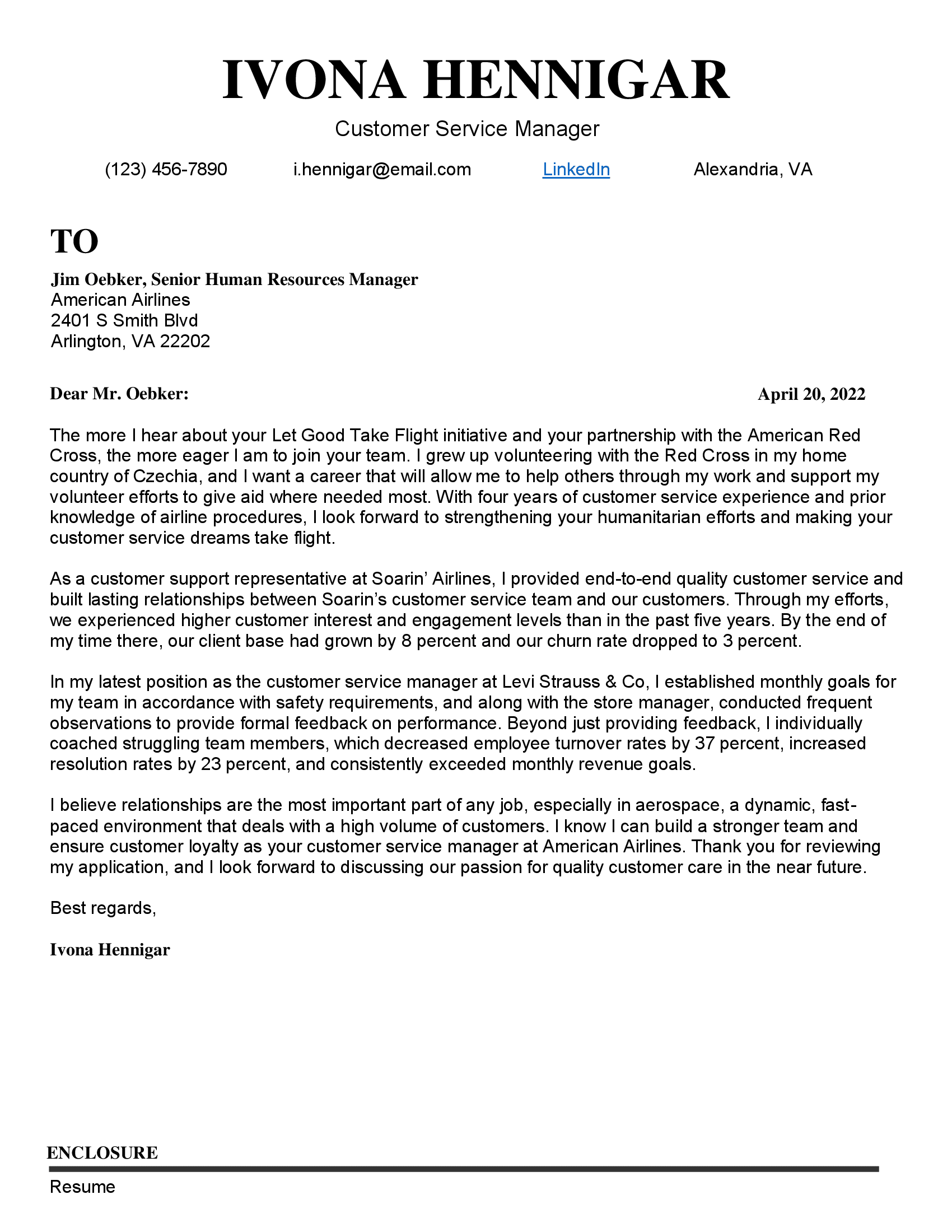 The following customer service manager cover letter example can give you some ideas on how to write your own letter. I am including my resume that lists my qualifications and experience. The tone should be warm and conversational, yet relatively formal.